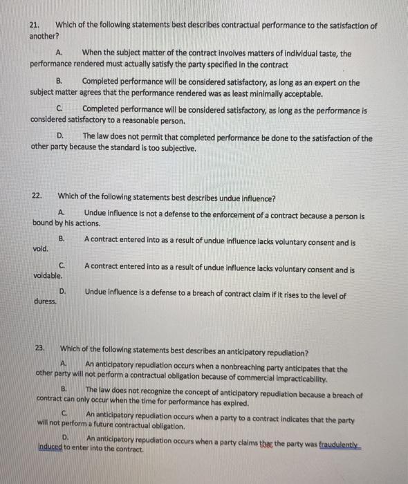 Which of the following best describes duress A situation where one party has from BUSA 2106 at Georgia State University. Up to 20 cash back 9. Assume that one part substantially but not completely performs a contract.